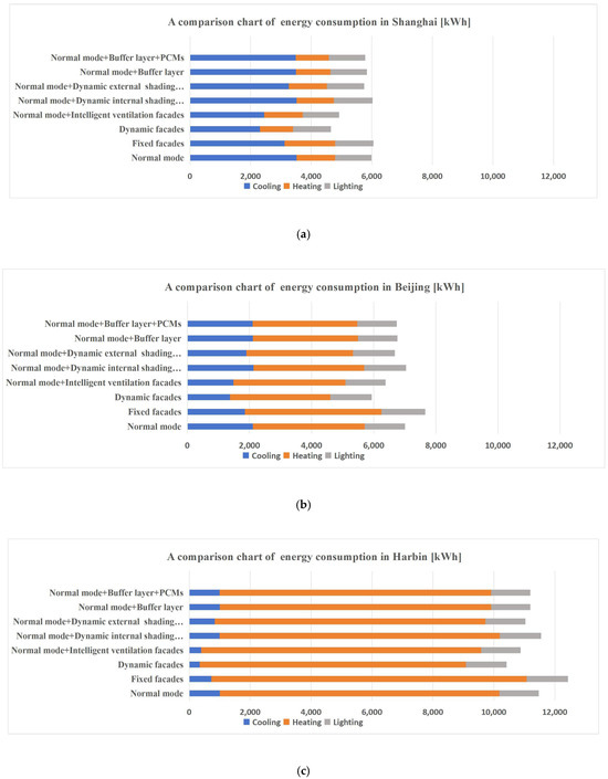 In Harbin, the building energy consumption was mainly composed of the heating energy consumption, with the energy consumption of lighting and cooling only accounting for approximately 20% of the total energy consumption. The dynamic facades reduced the cooling energy consumption by 4.78 kWh/m2 and the heating energy consumption by 3.18 kWh/m2 but increased the lighting energy consumption by 0.28 kWh/m2, which reduced the overall building energy consumption by 9.23%. The fixed facades reduced the cooling energy consumption by 2.03 kWh/m2 but affected the heating of the building in winter, increasing the heat load by 8.51 kWh/m2 and the lighting load by 0.47 kWh/m2, which raised the overall energy consumption by 8.35%. In terms of the energy consumption, the fixed facades was not suitable for the cold climate.