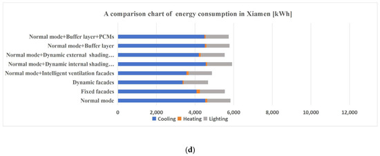Located in the climate with hot summers and warm winters, Xiamen exhibited building energy consumption dominated by the cooling and lighting load, with the former being predominant. Compared with the normal mode, the fixed and dynamic facades considerably raised the energy-saving efficiency in refrigeration, which reduced the energy consumption of 3.33 kWh/m2 and 8.50 kWh/m2, accounting for 10.05% and 25.91%, respectively, of that of the normal mode. In terms of lighting, the energy consumption of the dynamic and fixed facades rose by 0.65 kWh/m2 and 0.44 kWh/m2, accounting for 7.45% and 5.07%, respectively, of that of the normal mode. In terms of heating, the dynamic facades reduced the energy consumption by 0.34 kWh/m2, accounting for 46.19% of that of the normal mode. On the contrary, the fixed facade mode increased the energy consumption by 0.53 kWh/m2, reducing the energy saving by 70.93% relative to the normal mode.