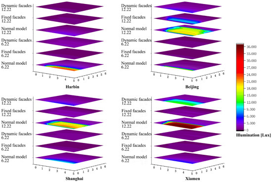 Given the different latitudes of the climate regions, the light environment parameters proved to be different under the same control strategies. On the summer solstice, due to the closure of the dynamic exterior shading facade on the south side, the indoor lighting was more comfortable and uniform in the dynamic mode than in the normal mode. Affected by the atrium skylight lighting, indoor illumination was higher in the dynamic mode than in the fixed mode. On the winter solstice, to prevent glare caused by the low solar height angle, the indoor curtain with the dynamic facades was closed, and the bamboo door on the south side was opened. In the dynamic mode, the indoor lighting declined relative to the normal mode; however, the range of exposure to solar radiation increased relative to the fixed mode, and the indoor temperature increased.