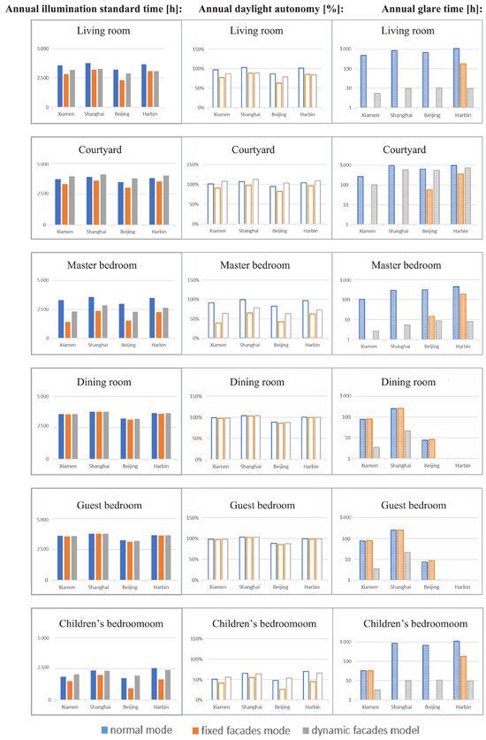 The illumination standard time (greater than 300 lux), glare time, and DA of the six rooms are shown in Figure 8. The overall DA value of the rooms of the three facade modes was higher than 50%. The DA value of the dynamic mode was higher than that of the fixed mode in the climate regions but slightly fell compared with the normal mode. The dynamic interior shading facade effectively reduced the indoor glare time, while the skylights designed according to the buffer layer rendered the illumination standard time and DA value of the children’s room and courtyard more in the dynamic mode than in the normal mode. Compared with the normal mode, adopting the dynamic facades reduced the annual glare time by 90.65%, 74.84%, 72.09%, and 75.53% in Xiamen, Shanghai, Beijing, and Harbin, respectively.