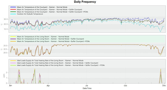 The simulation results for Xiamen are shown in Figure 9. Compared with the normal mode, after the buffer layer was set, the temperature of the living room improved, and the operation time of the air conditioner was delayed at night, thus reducing the load. The temperature of the living room on average rose by 0.5 °C, with a maximum of 2.5 °C. After PCM facades were set, the maximum indoor temperature dropped by 1–3 °C, the night temperature rose by 1–2 °C, and the continuous heat release improved the indoor comfort degree. In terms of the energy consumption, due to the mild winter and low heating demand in Xiamen, the overall energy-saving efficiency was not outstanding. The energy-saving efficiency rose up to 0.78% for the buffer layer and 1.55% for PCM facades. After the buffer layer and PCM facades were installed in the normal mode in the other three climate regions, the changes in the temperature of the courtyard and living room and the hourly heat load of the living room throughout the year are shown in Figures S4–S6. Air temperature during the competition outdoors, inner yard and dining room is shown in Figure S7 (Supporting Information). In the remaining three regions, the temperature of the courtyard improved after the setting of the buffer layer, while that of the living room and children’s room improved indirectly through the inner window. With the installed PCM facades, the temperature range of the courtyard grew smaller, thus avoiding the uncomfortable zone. The energy-saving efficiency of PCM facades in the cold climate was not ideal, in particular, in terms of improving the heating energy consumption in winter. The reason for this poor performance was that the outdoor temperature in the cold climate was too low in winter, and the courtyard temperature did not suffice to reach the phase-change temperature. The heat saved before and after the installation of PCM facades remained similar. Although the annual average temperature difference of the living room under the three facade modes was not pronounced, the heating load fell significantly through the effect of the buffer layer and PCM facades, and the temperature of the courtyard remained in a more comfortable range for a longer period, which improved the burning sensation caused by the excessive temperature in the normal mode. In conclusion, the buffer layer transitioned the indoor and outdoor air temperature change, while PCM facades further dampened the indoor temperature fluctuations and the difference between day and night temperatures. After the use of the buffer layer and PCM facades, the average energy saving-efficiency was estimated at 2.78%.