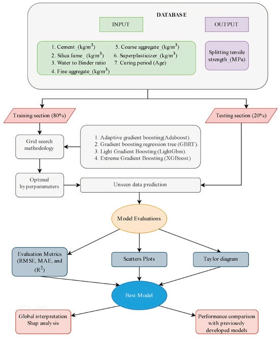 This research outlines its investigative methodology in three primary phases, as illustrated in Figure 1. Initially, raw data sourced from various studies is processed to create a refined database consisting of 158 samples where each sample consists of 7 input variables such as Cement content, SF content, Water-to-Binder ratio, Fine aggregate content, Coarse aggregate content, Curing period, and 1 output variable, which is splitting tensile strength. Next, the database is segmented into two categories: 80% of the total entries are allocated for the training phase and 20% for the testing phase, as per reference according to []. Four ensemble ML algorithms, including AdaBoost, XGBoost, GBRT, and LightGBM, are employed for training. This phase evaluates the performance of these ML algorithms using three metrics, including R2, RMSE, and MAE. To ensure model reliability, a validation technique involving 5-fold Cross-Validation is applied. The ML algorithms demonstrating the highest accuracy and reliability are then advanced to the third phase. In the third step, the splitting tensile strength is forecasted using the most effective ML models, with the analysis presented through a Taylor diagram. Global interpretation of tensile strength predicted by ML models is carried out by Shapley Additive Explanations. Finally, the performance of the best ML model is compared with the previously developed model to determine its superiority in terms of accuracy, therefore highlighting advancements in predictive modeling for the specific application area.