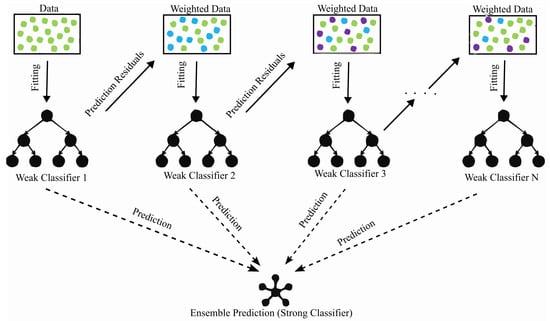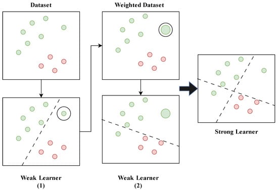 Freund and Schapire [] introduced the AdaBoost method in 1997, highlighting it as a prominent boosting technique. This method employs ensemble learning to unite multiple weak classifiers in a sequence, forming a robust classifier. Each weak classifier aims to improve on the errors made by its predecessor, therefore improving the accuracy of the model with the addition of more classifiers, although with the risk of overfitting and reduced generalization capability [,]. It works by applying a series of weak learners to the data. Each weak learner is associated with adjusted weights based on the previous learner’s effectiveness, with the emphasis typically being put on the tougher cases by giving them higher weights for greater attention. Figure 2 shows the AdaBoost classifier in action on a dataset with two features and two classes, illustrating how one weak learner improves upon the mistakes of another to produce a stronger decision boundary.