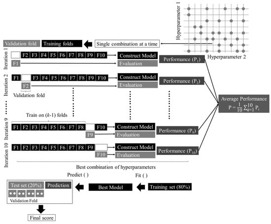 To further ensure robust performance and avoid overfitting, the dataset was split into an 80/20 ratio, with 80% allocated for training and 20% for testing. The training dataset was then subjected to 5-fold cross-validation during the grid search process. In this method, the training dataset was divided into five equal-sized subsets. The model was trained on four subsets and validated on the remaining one. This process was repeated five times, with each subset serving as the validation set once. The average performance across these five iterations provided a reliable estimate of the model’s generalization ability, offering a more accurate representation of how the models might perform on unseen data. This approach is depicted in Figure 4. After completing the grid search and cross-validation, the set of hyperparameters that yielded the best performance metrics was selected as the optimal set for each model. These optimal values, which include the number of estimators, learning rate, and maximum depth for each model, are documented in Table 1. For example, for the GBRT model, the optimal hyperparameters were found to be a learning rate of 0.01, a maximum depth of 3, and 600 estimators. Finally, to ensure the reproducibility and consistency of our experiments, a specific ‘random state’ parameter was applied to each machine-learning model using the Python scikit-learn library (3.7). This parameter controls the shuffling of the data before splitting it into training and testing sets, ensuring that the same samples are selected each time the code is executed. By fixing the random state, we guarantee that the division of data is consistent across different runs, which is crucial for accurately comparing model performance and validating results. This approach not only enhances the reliability of our findings but also allows other researchers to replicate our experiments with the same dataset and achieve identical results.