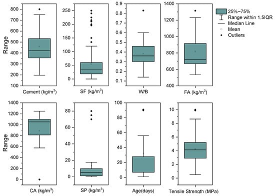 The dataset used to build our predictive models is collected from previous research []. This dataset is enriched by 158 experiments, presenting a comprehensive range of values for each predictive factor. As indicated in Table 2, the dataset features considerable variability in its measurements. The specifics include Cement content varying from 197 kg/m3 to 800 kg/m3, silica fume (SF) from 0 kg/m3 to 250 kg/m3, Water/Binder ratio (W/B) from 0.14 to 0.83, Fine Aggregate (FA) content from 535 kg/m3 to 1315 kg/m3, Coarse Aggregate (CA) from 0 kg/m3 to 1248 kg/m3, Superplasticizer (SP) from 0 kg/m3 to 80 kg/m3, curing Age from 1 day to 91 days, and tensile strength from 0.51 MPa to 10.00 MPa. The splitting tensile, which is the target variable in MPa, also shows significant fluctuation, starting at a minimum of 0.51 MPa and reaching a maximum of 10.00 MPa.