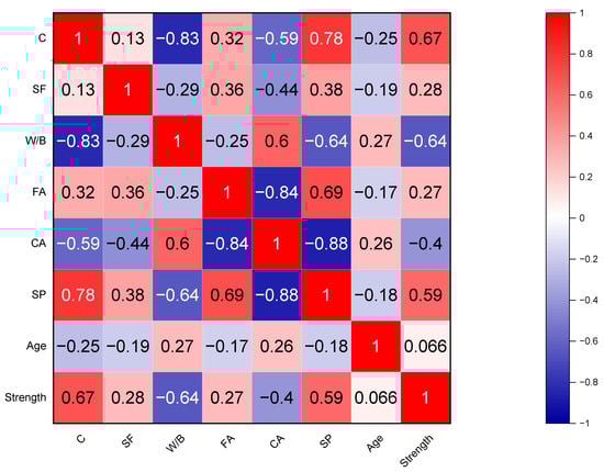 Figure 6 shows the Pearson Correlation Coefficients (PCCs) that demonstrate the connections between various mix design factors and the resulting tensile strength in SF concrete. PCC values range from −1 to 1, where 1 represents a perfect positive correlation, −1 is a perfect negative correlation, and 0 indicates no correlation. The Cement (C) content displays a strong positive correlation with tensile strength, indicating that an increase in cement content is typically associated with an increase in tensile strength. On the other hand, the Water-to-Binder ratio (W/B) exhibits a notable negative correlation with tensile strength, suggesting that higher water ratios may lead to a decrease in strength. The heatmap also represents the connections between mixed design elements themselves. For example, there is a strong negative correlation between the Water-to-Binder ratio (W/B) and cement (C), which could signify that mixes with less water relative to binders tend to have a higher cement content. The Fine Aggregate (FA) and Superplasticizer (SP) exhibit a negative correlation, indicating that as the use of superplasticizers increases, the proportion of fine aggregates tends to decrease. Inter-correlations between mix design variables, such as the negative correlation between Coarse Aggregate (CA) and Superplasticizer (SP), may indicate compensatory adjustments in mix designs to achieve desired workability and strength properties. Additionally, the positive correlation between Cement (C) and Superplasticizer (SP) suggests that mixes with higher cement content may also employ more superplasticizers to maintain workability. These correlations provide valuable insights into the complex interactions that govern the material properties of SF concrete. They are critical for optimizing concrete formulations for enhanced tensile strength and overall performance.