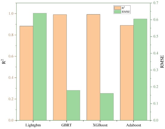 Statistical assessment of models is presented in Table 3. As we can notice, the GBRT and XGBoost models showed superior performance, maintaining nearly perfect R2 scores of 0.999 during training and impressive scores above 0.955 in testing, indicating their high accuracy in both phases. LightGBM and AdaBoost, while slightly lagging behind, still demonstrated robust performances with R2 scores of 0.897 and 0.902, respectively, in training and 0.799 and 0.845 in testing. The RMSE and MAE values further illustrate the models’ precision, with GBRT and XGBoost showcasing remarkably low error rates across all phases; RMSE values as low as 0.057 and 0.059 in training and 0.179 and 0.161 in the total evaluation highlight their efficiency in minimizing prediction errors. In contrast, LightGBM and AdaBoost exhibited higher errors in all total phases yet maintained a competitive stance with MAE scores like 0.416 for LightGBM and closely matched RMSE scores such as 0.605 for AdaBoost in the same phase. This analysis suggests a clear performance hierarchy: , underscored across metrics like R2, RMSE, and MAE, and different evaluation stages (Training, Testing, All). GBRT and XGBoost’s near-perfect accuracy rates suggest a potential overfitting to the training data, but their strong testing phase performance indicates a good generalization ability. In his study, ref. [] emphasized that to avoid the problem of overfitting, the difference in R2 between the training and testing phases should be less than 0.05, a criterion that was met by the GBRT and XGBoost models. Figure 7 visually represents the precision of each developed model across the overall phase, showcasing their effectiveness through R2 and RMSE metrics and distinctly emphasizing the superior forecasting accuracy of the GBRT and XGBoost models.