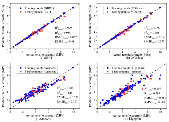 In these scatter plots, model-predicted data points are plotted against actual experimental data along a diagonal line representing a one-to-one prediction ratio, often referred to as the 45-degree line, originating from the plot’s axis intersection. The precision and validity of the models are indicated by how closely the data points align with this diagonal line. The aggregation of data points near this line signifies a higher accuracy of the model. As demonstrated in Figure 8, a graphical analysis using these plots was conducted to evaluate the trustworthiness of the model predictions made in this research. The scatter plots from Figure 8a–d reveal that all four models, which were formulated to predict the splitting tensile strength, are reliable and accurate, as demonstrated by the strong correlation between the predicted and actual values. A closer examination of Figure 8a,b reveals that the XGBoost and GBRT models are particularly effective at predicting splitting tensile strength, outperforming the other models. Similarly, Figure 8c,d indicates that the AdaBoost model has a comparable level of accuracy to the LightGBM model, showcasing its suitable performance.
