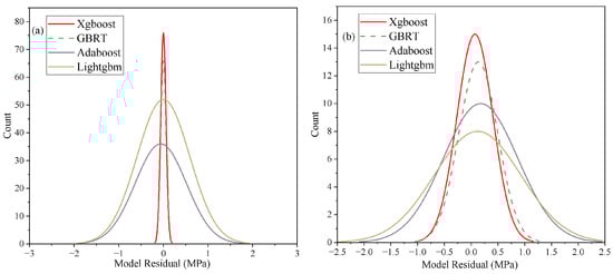 The histogram analysis (Figure 9) comparing the residual distributions of four distinct ML models—XGBoost, GBRT, AdaBoost, and LightGBM—highlights several key findings pertinent to their application. XGBoost and GBRT demonstrate superior fit to the training data, as demonstrated by residuals densely packed around zero, signifying high accuracy and robust model fit. In comparison, AdaBoost and LightGBM show reasonable performance with slightly broader residual distributions, indicating a marginally weaker fit. When considering generalization capability, as inferred from test dataset performance, XGBoost and GBRT maintain good precision, highlighting its excellent adaptability and accurate prediction of new, unseen data. This contrasts with the other models, whose wider spread in residuals may signal a decline in predictive performance on the test dataset, raising concerns about their generalizability. Overall, the analysis suggests XGBoost and GBRT as optimal models for the application at hand, given their tight residual distribution and consistent performance across both training and test datasets, affirming their capability to balance training data fit with generalization to new data effectively. In contrast, AdaBoost and LightGBM exhibit slightly broader residual distributions. The wider residual distributions imply that the predictions made by these models are more variable, leading to a higher likelihood of errors.