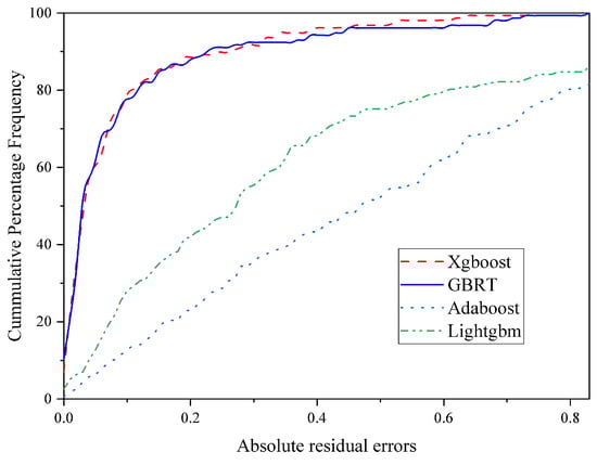Figure 10 shows the relationship between absolute errors and the percentage of cumulative frequency in all the models introduced in this study. It is apparent that a minimal percentage of predictions made by the LightGBM model are within the minimal absolute error margin of 0 to 0.2. The graph shows that more than 90% of the predictions from the XGBoost and GBRT models have an absolute error close to 0.2. Moreover, the trajectory of these models reaches a cumulative frequency percentage of 100, representing the entirety of data points, more quickly than its counterparts, indicating that a considerable number of predictions by those models maintain an absolute error below 0.8. Consequently, the illustration suggests a superior predictive capability of the GBRT and XGBoost models compared to the others featured in this analysis.