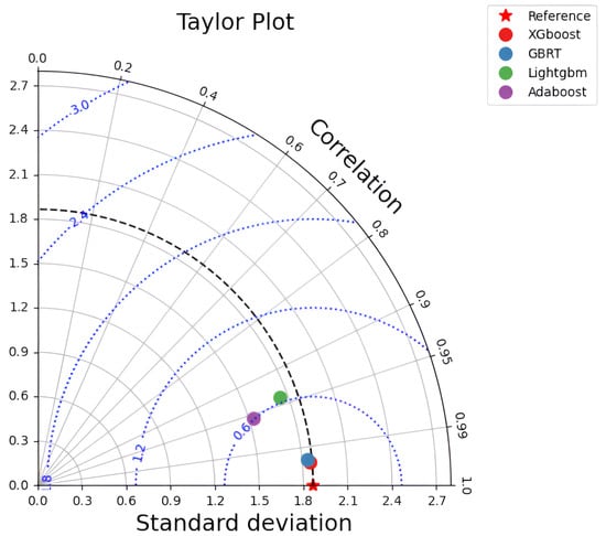 Figure 11 illustrates a widely used method for comparing multiple models through a two-dimensional graphic, which incorporates three statistical metrics: SD, RMSE, and R. In the Taylor diagram, each model is denoted by a distinctively colored dot. A “star symbol” located on the x-axis represents the statistical values associated with the experimental data (SD = 1.87, RMSE = 0, and R = 1). The proximity of each model to this reference point indicates its performance. The blue arcs in the diagram represent the lines of constant RMSE radiating from the reference point. Constant SD lines are shown as black arcs originating from the center of the diagram and intersecting the axes, while black lines extending from the center depict lines of constant R values. The positioning of a model relative to the reference point suggests its effectiveness, with the LightGBM and XGBoost models identified as the least and most effective, respectively, in predicting the splitting tensile strength.
