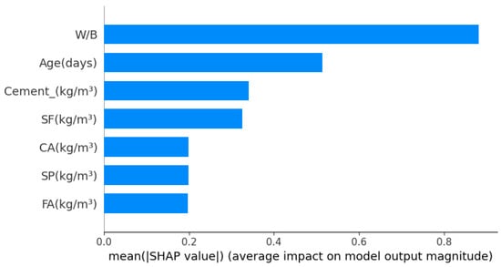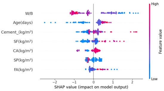 Figure 13 displays the positive and negative effects of various components on splitting tensile strength. Accordingly, features such as Age, cement, SF, fine aggregate, and coarse aggregate contribute positively to tensile strength. In contrast, the W/B ratio and superplasticizer negatively impact tensile strength. These results are consistent with the findings presented in existing studies [,].