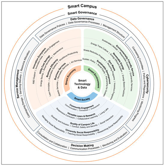 A pioneering smart campus conceptual framework [22] was developed, incorporating four key normative dimensions adapted from smart cities research [23]: society, economy, environment, and governance. These dimensions are aligned with the core principles of digital technology and big data. The rationale for adopting these dimensions from smart city research stems from the prevailing argument that the smart campus is a scaled-down version of the smart city [24]. This makes the smart campus an ideal testbed, functioning as an urban living lab to explore and apply smart city concepts [11].