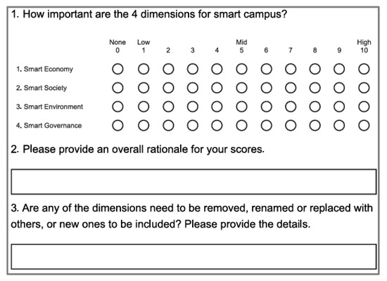 The questionnaire was meticulously designed to gather in-depth insights into the smart campus assessment framework, integrating both qualitative and quantitative data. It was organized into three key sections corresponding to the framework’s components: dimensions, categories, and indicators. The primary objective was to assess whether expert consensus could be achieved on the framework. Participants were asked to rate the importance of each of the 68 components, comprising four dimensions, 16 categories, and 48 indicators. To ensure a holistic understanding, each closed-ended question was complemented by two open-ended questions, allowing participants to provide additional comments, clarifications, or feedback as necessary [31].