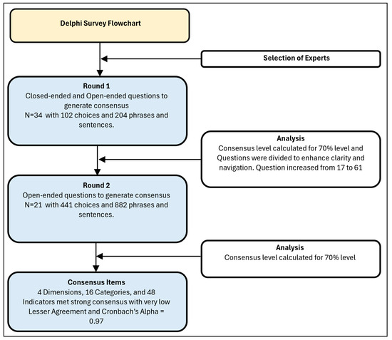 To improve clarity and presentation, the Round 2 questionnaire was revised, increasing the number of questions from nine in Round 1 to sixty in Round 2. The 16 categories were grouped under their corresponding dimensions, increasing the category-related questions from three to twelve and indicator questions from three to forty-eight. This restructuring aimed to enhance participants’ understanding and facilitate a more informed consensus.