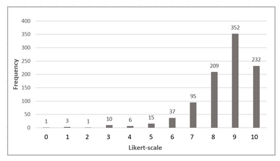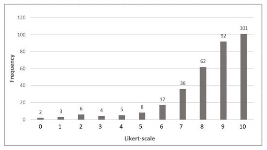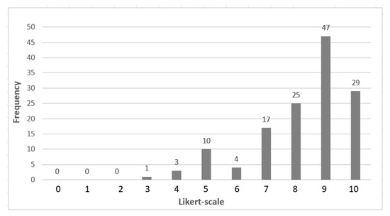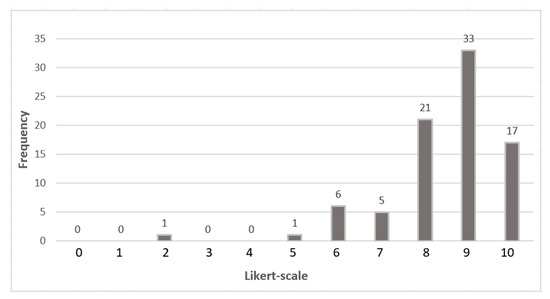 In Round 2, the survey was conducted exclusively with the expert group of 34 participants identified in the first round. Weekly reminders were sent over a three-week period, resulting in 21 fully completed responses and a response rate of 62%. In this round, responses from the 21 experts yielded a total of 84 scores across the four dimensions. The results demonstrated a strong consensus, as illustrated in Table 8 and Figure 9. Only one score fell below 5, and another was at the midpoint, while the vast majority—82 scores, or 98%—exceeded the midpoint, indicating a high level of agreement among participants.