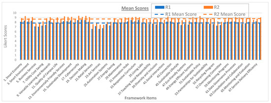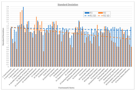 The standard deviation was also improved, as shown in Figure 13, to drop below the required threshold of 2.0. This demonstrated how close the experts’ responses were to confirming the 68 items of the framework. There were, however, five items out of the sixty-eight in Round 1 that had SDs higher than 2.0, which included Innovation Ecosystem, Quality of Campus Life, Automation Systems, Zero Waste, and Diversity and Inclusion. This is likely due to a degree of misunderstanding by the participants as the items are, by their nature, significant. Moreover, in Round 2, there were also nine out of sixty-eight items, which included Business Efficiency, Utility Cost Saving, University Social Responsibility, Sustainable Development, Zero Waste, Data Governance, Lean Principles, Workforce Productivity, and Diversity and Inclusion. It is noted that these incidents are marginal and did not have any significant bearing on the overall agreement level in the Delphi analysis.