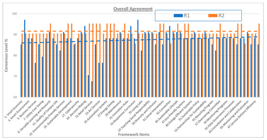 This Delphi study marks the first to employ this method for identifying and reaching consensus on a smart campus assessment framework. Conducted over two rounds spanning four months, the study’s results are shown in Figure 12, Figure 13, Figure 14 and Figure 15. Notably, consensus was achieved in Round 1, with 67 of the 68 items scoring an overall agreement (OA) above the 70% threshold, as shown in Figure 14. Thus, the smart campus makeup of the four smart dimensions of economy, society, environment, and governance was observed to model a smart university. Moreover, the 16 categories and 48 indicators provide the essential components for a robust smart campus framework.