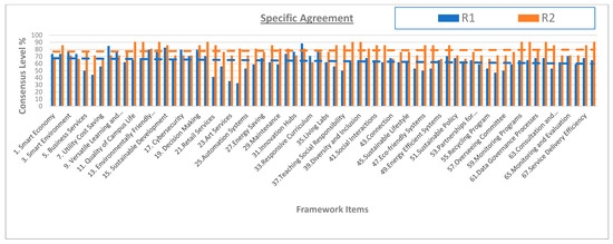 As anticipated, the changes led to improved results in Round 2. The low specific agreement of 20 in Round 1 tripled to 60, significantly raising consensus levels. Additionally, the overall agreement reached a perfect score of 68 items (100%), far exceeding the 70% consensus threshold. The Cronbach’s alpha was notably high and remained consistently high (0.98), indicating strong reliability and consistency among the participants’ responses. This bolstered confidence in the data collected through the Delphi process for the smart campus assessment framework.