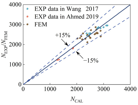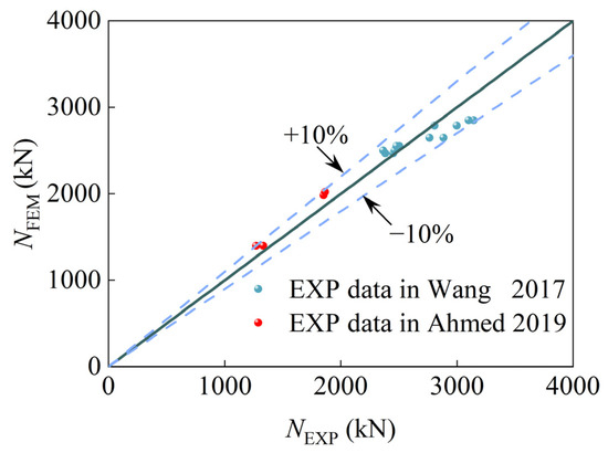 - Utilizing the constitutive relationship of core concrete made with coarse aggregate derived from spontaneously combusted coal gangue, a finite element analysis model for SCGCA-CFDST stub columns was created. The model was validated against the existing literature, achieving an average absolute error of 2.21%. The average value (μ) and standard deviation (SD) of NFEM/NEXP were 0.99 and 0.061, individually. The outcomes demonstrate the precision of the finite element model presented in this research for predicting the mechanical performance of SCGCA-CFDST stub columns.
