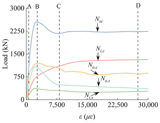 3.1. Relationship Between Load and Strain of Each Part of the Structure During Axial Loading Process