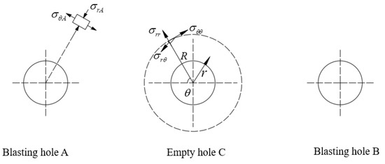 As illustrated in Figure 1, the blast holes A and B are the charge holes to be detonated, with hole C in the middle being an empty hole. Holes A and B are symmetrically arranged on the left and right of hole C. Following detonation, the explosives within the aforementioned holes will generate a shockwave. As the propagation distance in the rock increases, the shockwave will also intensify. The wave gradually attenuates into a stress wave that continues to propagate through the rock. Before reaching the empty holes in the vicinity of the stress field (as illustrated in the upper-left quadrant of Figure 1), the stress wave has not yet been transmitted through the A hole. Assuming that the A and B holes have identical diameters and charges, then the time required for the stress waves generated by these holes to reach the empty hole C is also identical. The A and B boreholes are similar in diameter and charge. Consequently, the burst stress waves transmitted to the empty hole C are identical, and their timing is also consistent. Concurrently, the actual project, wherein the distance between the holes is frequently tens of times the diameter of the holes r. It can be approximated that the surrounding area of hole C is uniformly compressed, and the force on the hole edge unit is shown in the middle of Figure 1.