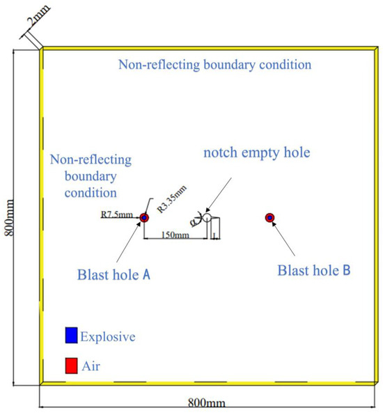 In this paper, the experimental parameters of Nakamura [33] are used as a reference point. The objective is to study the influence of notch length and angle of empty holes on directional fracture blasting. To this end, a numerical model is established using the LS-DYNA finite element software (Figure 2). The overall size of the model is 800 mm × 800 mm × 2 mm. The rock material adopts the Lagrange algorithm, and the fluid material, such as air and explosives, adopts the ALE algorithm to make the rock material and the fluid material co-node and realize the fluid–solid coupling algorithm. The empty and blast holes have identical dimensions, measuring 15 mm in diameter. The diameter of the explosives is 6.7 mm, an uncoupled charge is employed, and the length between the blast hole and the notch hole is 150 mm. The detonation mode is double-hole simultaneous detonation. The length of the notch is L, and the angle of the notch is α. The model is circumscribed by a non-reflective boundary, and the front and back are constrained by the normal to the z-direction. The number of meshes is 132,936.