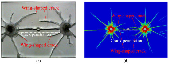 A comparative analysis of the simulation results and the test results. (a) Single-hole experiment results [40]; (b) simulation result of single-hole; (c) notched empty hole test results [41]; (d) simulation result of notched empty hole.