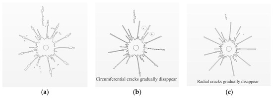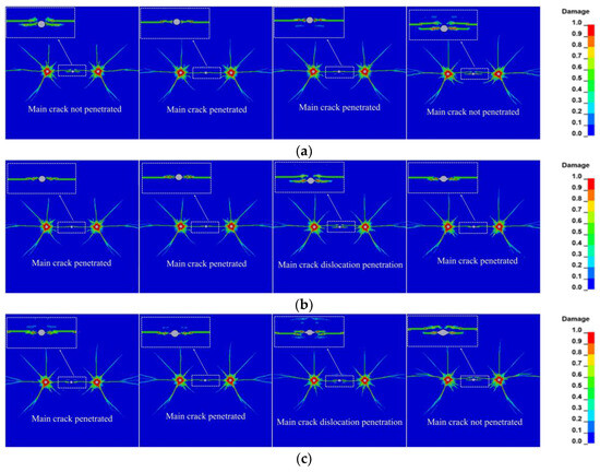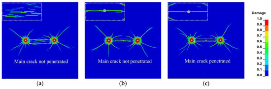 Through numerical simulation, we analyzed crack propagation in double-hole explosions under three different cases: without empty holes, ordinary empty holes, and notched empty holes (Figure 4). In Figure 4a, when the empty hole is not set, although the main cracks of the left and right blast holes expand in opposite directions, they are eventually misplaced and fail to form through cracks. In Figure 4b, with ordinary empty holes, the main crack of the left hole is penetrated, while the main crack of the right hole is not. In Figure 4c, with notched empty holes, the main cracks between the left and right holes are well developed, and the fracture surface finally forms along the line connecting the two holes.