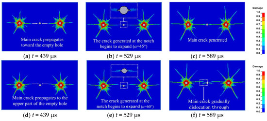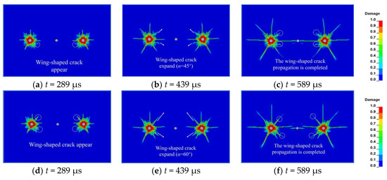 Figure 8 illustrates the propagation of wing cracks when the notch length is 2.5 mm and the notch angles are 45°and 60°. From Figure 8a–c, it is evident that at t = 289 μs, wing cracks begin to form due to the effects of stress waves and detonation gases following the explosion. At t = 439 μs, the wing cracks further develop and expand upwards, perpendicular to the empty notch hole. At t = 589 μs, the wing cracks cease to expand toward the hole. From the comparison with Figure 9a, it is evident that at this point, after the double-hole explosion, the stress waves did not create a concentrated region of compressive stress in the direction vertical to the notch hole. However, when the notch angle is 45°, the wing cracks continue to expand. In Figure 9b, it can be observed that as the stress waves propagate, concentrated compressive stress appears above and below the notch hole (in green). It is precisely due to the formation of this concentrated compressive stress area that the wing cracks continue to expand toward the notch hole. In summary, the compressive stress generated in the direction vertical to the notch hole after the explosion controls the direction in which the wing cracks propagate, causing them to expand in that direction. Additionally, the concentrated compressive stress area formed above the notch hole promotes further expansion of the wing cracks.
