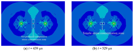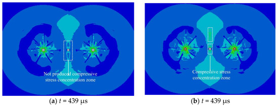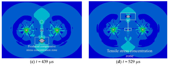 As shown in Figure 6d–f, at t = 439 μs, radial short cracks begin to appear following the explosion; however, the main crack starts to extend upward toward the vertical notch hole. At this time, combined with Figure 7c, the appearance of a compressive stress concentration area (in green) is observed in the direction perpendicular to the notch hole. At t = 529 μs, a crack begins to appear at the tip of the notch hole. At this time, in conjunction with Figure 7d, an evident tensile stress concentration area also appears at the tip of the notch hole. At t = 589 μs, the main crack generated from the blast hole becomes misaligned with the crack that forms at the tip of the notch hole (in deep blue). Considering this observation together with Figure 5b, it is evident that the main crack ultimately creates a fracture surface along a line deviating from the blast and notch holes. This phenomenon indicates that stress concentration at the notch tip after explosion alters the stress field distribution around the cavity, which transforms from a compressive to a tangential tensile stress state. Consequently, cracks begin to form at the tip of the notch hole and actively propagate in the direction opposite to the main crack, resulting in a directional fracturing effect.