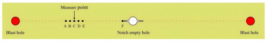where and are radial stress and tangential stress in the rock, p is the pressure generated by the explosion, is the distance from any point in the rock to the charge center, is the radius of the blast holes, α is the stress attenuation index, α = 2 − λ, λ is the lateral stress coefficient, λ = μ/(1 − μ), and μ is the Poisson’s ratio of the rock.