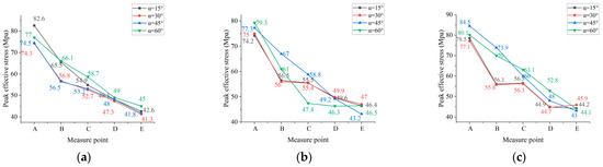 Figure 11 illustrates the variation in peak effective stress under explosive load with notch angle for different notch lengths. As illustrated in Figure 11, the peak effective stress gradually decreases from point A to E as the position of the measurement point approaches the empty hole side. This is because, after the detonation of the two holes, the explosion energy is utilized to break the rock, resulting in the continuous decay of stress waves. At this point, the peak effective stress will continue to decrease as it approaches the empty hole of the notch.