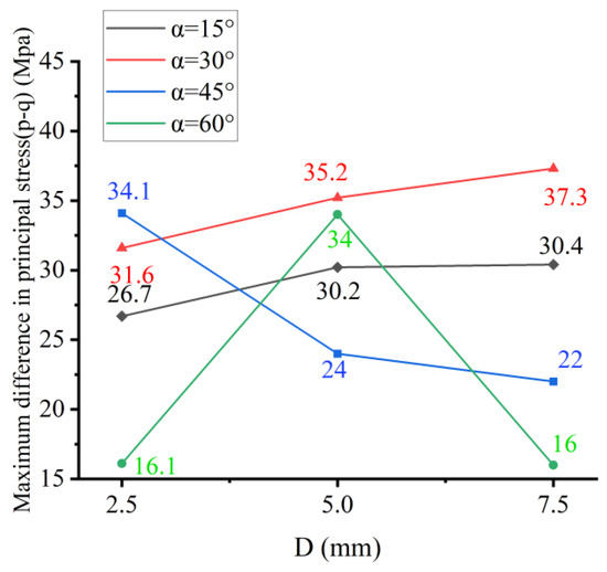 Figure 12 shows the change diagram of the principal stress difference under different working conditions of measuring point F (the notch tip). It can be concluded from the diagram that when the notch angle is 30° and 15°, the difference in peak stress increases with the increase in notch length. When the notch angle is 45°, the difference in peak stress decreases with the increase in notch length. Compared with Figure 5, we see that when the peak stress difference at the notch is too small—that is, at points when the stress concentration phenomenon is weakest—the main crack generated by blasting will appear noncontinuous or misaligned, such as in working conditions A1, C2, C3, D1, and D3. The appropriate notch length can be used to effectively enhance the principal stress difference to better utilize stress concentration characteristics in improving the directional control over cracks.