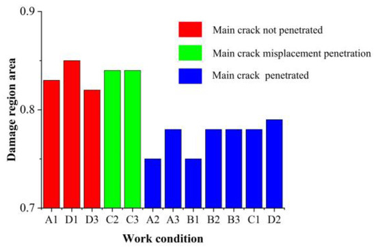 The damaged area of rock is the key index for evaluating the blasting effect. To study the influence of different notch hole parameters on rock damage caused by directional blasting, we counted the number of rock units where the damage factor D exceeds 0.4 under all working conditions. Figure 14 illustrates the area of rock damage caused by blasting under different working conditions. The red area represents instances where the main crack is not penetrated, the green area indicates cases of misalignment of the main crack, and the blue area depicts instances where the main crack is penetrated. When the effect of directional fracture is not ideal (including when the main crack is not penetrated or penetration is misaligned), the area of damaged rock is significantly larger than the area where the directional fracture effect was ideal. From this, we conclude that ideal fracture effects can be achieved using the appropriate parameters for notch holes, effectively reducing damage to surrounding rocks.