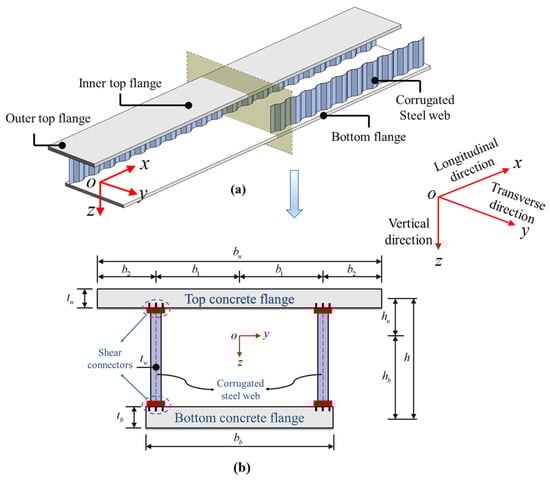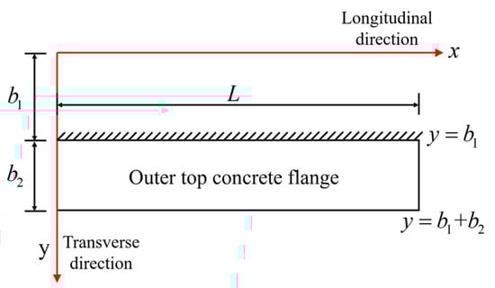 The shear lag effect on box girders is primarily caused by shear deformation of the concrete flanges, which leads to a non-uniform distribution of longitudinal normal stress along the transverse direction [49,50]. As a result, a reasonable shear-lag warpage displacement function for CBGCSWs can be defined based on the shear deformation laws of the top and bottom concrete flanges. The cross-section of the CBGCSW is displayed in Figure 5.