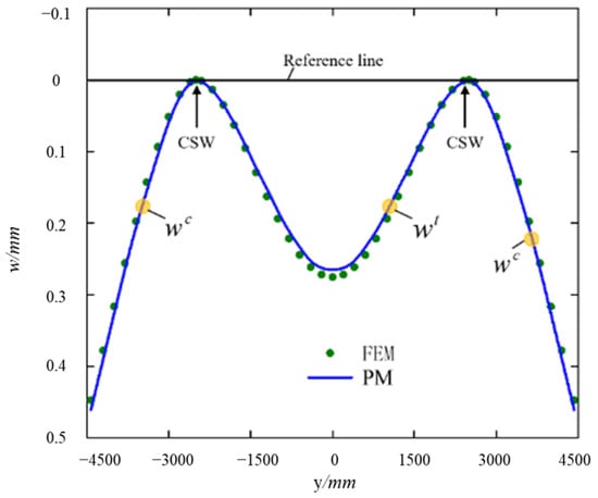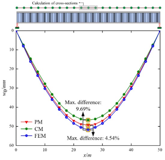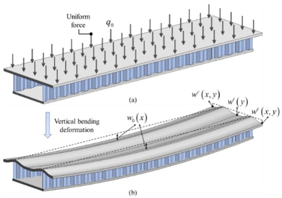 A uniformly distributed load with an intensity of q0 is applied to the CBGCSW, as shown in Figure 2a. The deflection of the composite box girder can be expressed as follows:
