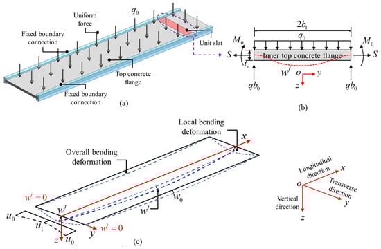 The shear lag effect is usually observed in bridge engineering structures, especially, thin-walled box girders [1,2,3,4]. Due to their lightweight nature, high shear resistance, and low pre-stress loss, composite box beams with corrugated steel webs (CBGCW) are increasingly used in bridge construction [5,6,7]. In CBGCWs, shear deformation caused by the web has an important impact on vertical deflection, making the shear lag effect more pronounced compared to traditional concrete box girders [8]. However, existing methods for the shear lag effect often overlook transverse bending of the top flange under load [9,10]. In box girders with thin concrete flanges and large span–to–depth ratios, the top flange undergoes significant transverse deformation when subjected to vertical loading [11]. Consequently, neglecting this transverse deformation fails to capture the variation of the shear lag effect along the thickness of the top flange.
