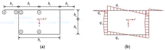 The box-girder section shear flow distribution: (a) a cross-sectional diagram and (b) shear flow distribution.
