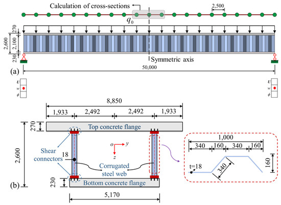 A composite box girder with corrugated steel webs: (a) a 3D view; (b) a cross-sectional view.