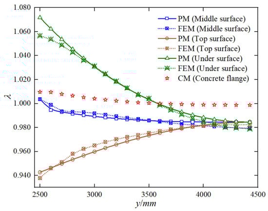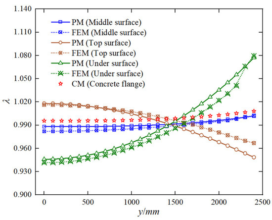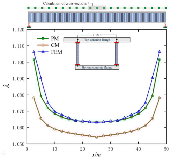 Considering H varies from 2500 mm to 3000 mm with a constant L = 50 m, the height–span ratio is in the range of 0.05 to 0.06. The impact of the height–span ratio on the shear lag effect in CBGCSWs at various cross-sections was presented in Figure 20, Figure 21, Figure 22 and Figure 23. In Figure 20, the relationship between the shear hysteresis factor λ and the distance along the longitudinal direction of the simply supported bridge is shown. It can be observed that the shear lag effect is symmetrical, initially decreasing and then increasing. Figure 21, Figure 22 and Figure 23 illustrate the effect of the height–span ratio on the shear hysteresis factor λ at the top, middle, and bottom surfaces of the top flange. In Figure 21, the shear lag effect in the top surface of the flange shows a slight increase in the height–span ratio followed by a decrease. In Figure 22 and Figure 23, the trend shows a monotonically increasing effect. It is clear that the influence of the height–span ratio on the shear hysteresis factor λ differs significantly between the top and bottom surfaces.