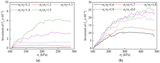 Evolution of the fabric tensor during the constant stress ratio tests: (a) σz/σx = 1.1~1.5; (b) σz/σx = 1.6~2.0.