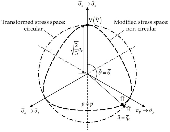 Another step of stress mapping is used to generalize the constitutive model from triaxial compression to true triaxial stress state (Yao and Wang [29]). As shown in Figure 4, the yield/failure surface in the modified stress space is non-circular according to the Matsuoka–Nakai criterion, demonstrating the effect of the intermediate principal stress. After the stress mapping, it turns into the circumcircle of the original surface on the same deviatoric plane. Thus, in the new stress space, namely, the space of transformed stress , the yield strength and critical state stress ratio under any 3D stress state are identical to those under triaxial compression. The above goal of this mapping is formulated as