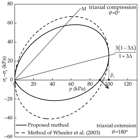 Based on Equations (2) and (4), decreases after the stress modification, while and increases, because . Points and are mapped downwards to points and , respectively, as shown in Figure 1. Therefore, the difference in yield strength along vertical and horizontal directions is narrowed, and the soil could be treated to be isotropic in the modified stress space. Compared with the formula in the works of Tobita and Yanagisawa [24] and Yao et al. [25], Equation (2) can ensure for any and . It is necessary to note that keeping the mean stress unchanged is very important for the development of the soil constitutive model, because soil is a non-linear and pressure-dependent material. If the mean stress varies, the stiffness, strength, and many other properties of the soil are changed. We cannot distinguish whether the difference in the prediction results obtained using the constitutive model is caused by the variation of the loading direction or by that of the mean stress. What is more, there are some constitutive ingredients that are only related to , but independent of the loading direction and soil fabric, such as the critical state stress ratio and void ratio (Li and Dafalias [26]; Wang et al. [27]; Deng et al. [28]). A varying cannot guarantee the uniqueness of the critical state line. Equation (2) can avoid this problem without much revision to the modified stress method.