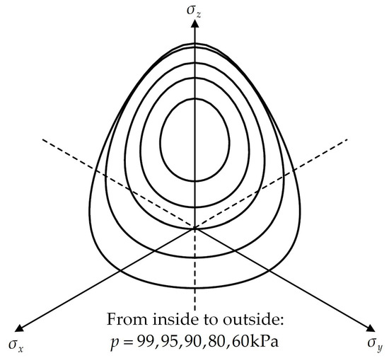 The anisotropic yield surface in a 3D stress space is shown in Figure 5. It can be seen that the yield surface rotates towards the -axis, indicating a greater yield strength along this direction. The hydrostatic axis where does not pass through the vertex of the yield surface. The yield surface is not an ellipsoid, because it has different intercepts for different Lode’s angles, especially when is relatively smaller. Wheeler et al. [6] pointed out that if the method is adopted to generalize the rotated yield surface to a 3D stress space, a singularity appears. Based on the proposed method, the 3D anisotropic yield surface is continuous and smooth, showing its good performance in describing the yield property of the anisotropic soil in a complex stress state. Moreover, the proposed method is also capable of generalizing other kinds of yield surfaces or bounding surfaces, other than the elliptical yield surface of the MCC model.