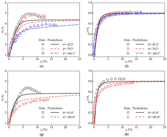 Comparisons between the experimental data and model predictions of the horizontally deposited San Francisco Bay mud from true triaxial tests: (a,b) b = 0.00; (c,d) b ≈ 0.42; (e,f) b ≈ 0.71; and (g,h) b ≈ 0.96.