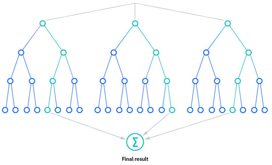 Figure 2. An example of a random forest classification tree [https://www.ibm.com/it-it/topics/random-forest, accessed on 23 November 2023]. - Artificial Neural Network (ANN): This model is inspired by a brain’s neural networks, comprising layers of interconnected nodes or neurons. Each node processes the input data, which then travel through multiple layers, each altering the input uniquely. ANNs excel in learning intricate patterns in data by modifying the weights of the connections between neurons through backpropagation. Figure 3 shows the architecture of the ANN used in our work: after normalization, the data are passed onto the ‘Feature Augmentation’ module, which applies mathematical transformations to the numeric values (building coordinates and distance to the five main epicenters) in order to improve both the model’s ability to assign the correct vulnerability to each location and the overall performance.