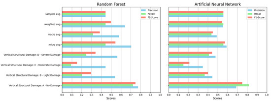 The results reported in Figure 5 show the performance of both models when tested on the validation dataset; that is, on new data the models had not seen during training. One can see that the ANN achieved higher precision and recall on all classes, being especially capable of identifying the highest damage class (D3—severe damage) when compared to the random forest.