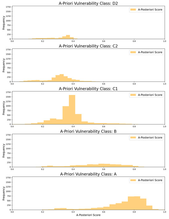 Finally, to better appreciate the difference between the two approaches, in Figure 11, we plot the distribution of our “a posteriori” vulnerability score within each “a priori” vulnerability class, from the least vulnerable (D2) to the most vulnerable (A). This visual data representation enables us to discern the considerable improvement in both the quality and the quantity of information yielded by our novel scoring system.