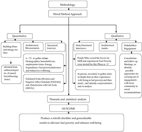 The methodology consists of a mixed-methods approach (Figure 3). Employing a quantitative approach provides a systematic examination of energy consumption, heating expenses, household income, and well-being metrics. Methodical surveys and utility analyses form the basis for measuring fuel poverty and well-being indicators, offering empirical data and statistical insights. This quantitative foundation allows for the identification of trends, correlations, and potential causal relationships between fuel poverty and well-being in social housing. To complement this, this research incorporates energy simulations for a selected housing unit, utilising advanced modelling techniques to predict energy consumption patterns, assess potential efficiency measures, and estimate their impact on fuel costs and indoor environmental quality. Qualitative data collection involves in-depth interviews and discussions, offering participants the opportunity to openly share their lived experiences, perceptions, and challenges related to fuel poverty and well-being. This qualitative investigation adds depth, context, and a comprehensive understanding to the study of the interplay between energy-related challenges and dimensions of well-being by exploring underlying psychological dynamics, contextual subtleties, and personal narratives.